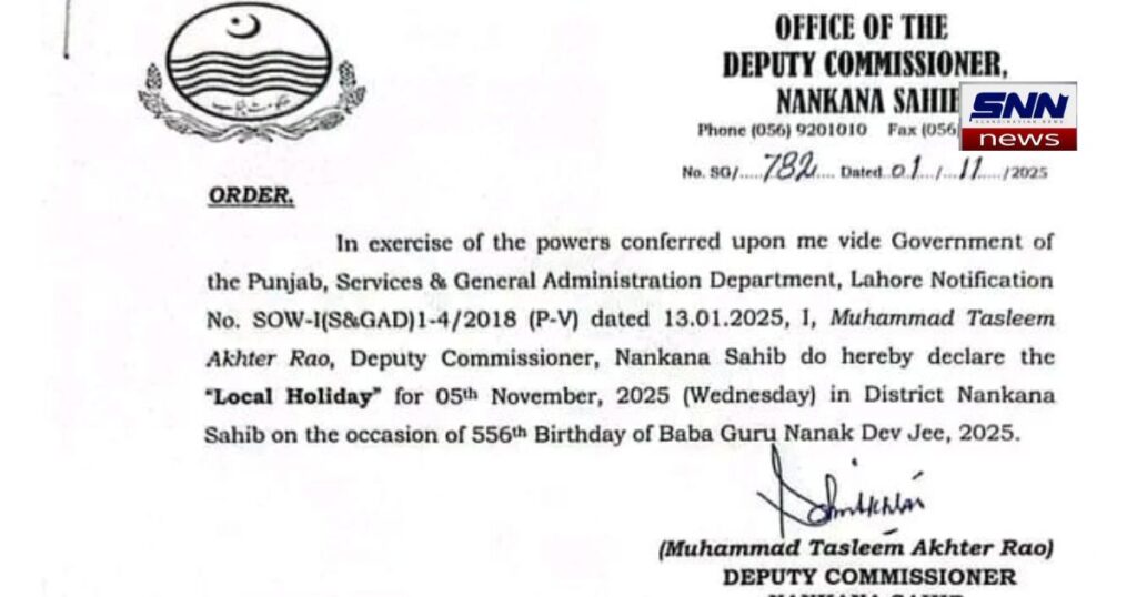 میاں عارف اسلم ایس این این نیوز اردو ننکانہ صاحببابا گورونانک کے جنم دن کے موقع پر ضلع ننکانہ صاحب میں 5 نومبر کو عام تعطیل کا اعلان۔ ڈپٹی کمشنر ننکانہ صاحب محمد تسلیم اختر راؤ نے نوٹیفکیشن جاری کرتے ہوئے کہا ہے کہ کل 5 نومبر کو ضلع کے تمام سرکاری دفاتر، اسکولز اور […]